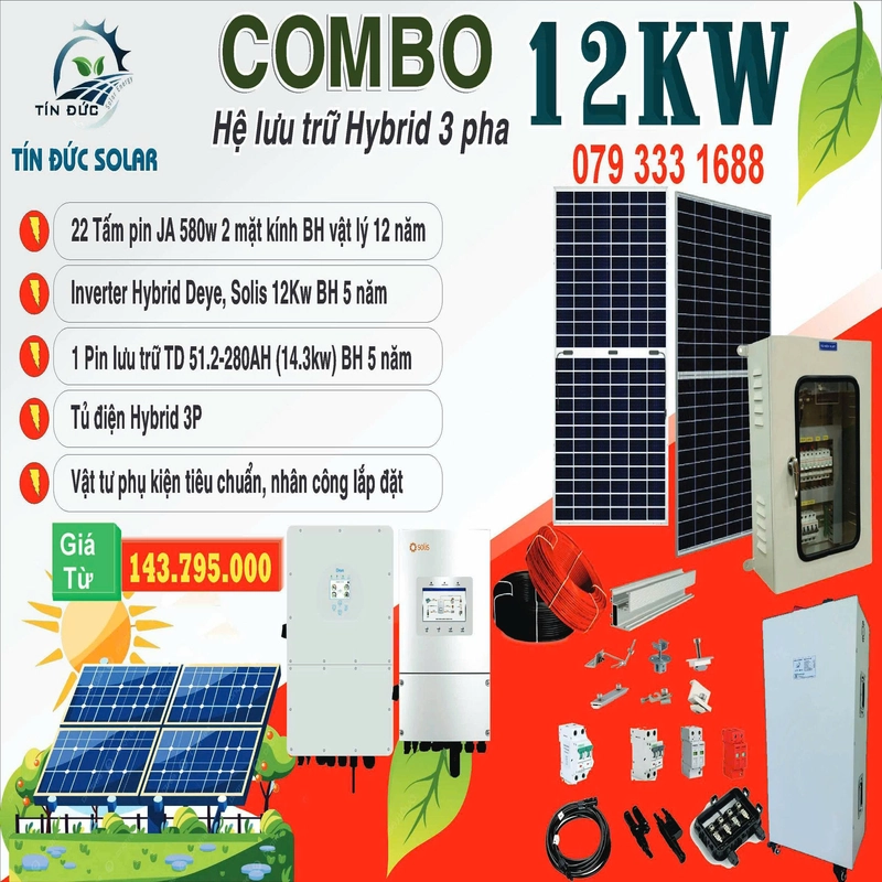 Combo hệ lưu trữ hybrid 3 pha 12kW là một hệ thống điện mặt trời kết hợp hòa lưới và lưu trữ, sử dụng bộ inverter hybrid 3 pha 12kW, kết hợp với các tấm pin năng lượng mặt trời và pin lưu trữ lithium. Hệ thống này cho phép người dùng vừa sử dụng điện mặt trời trực tiếp, vừa lưu trữ điện năng dư thừa để sử dụng khi cần thiết, đồng thời giảm phụ thuộc vào lưới điện.